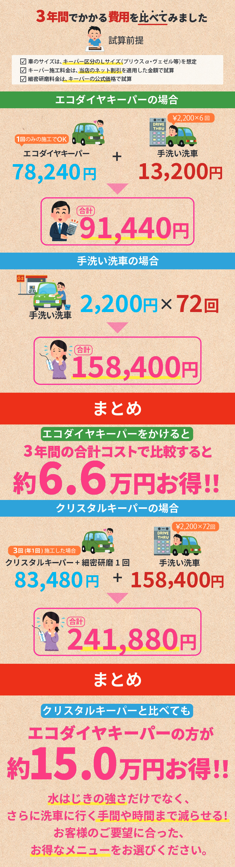 「車のコーティングをしたいのですが、クリスタルキーパーとダイヤモンドキーパーと、他にどんな種類がありますか?」と尋ねると「ダブルダイヤモンド、EXなど新車専用のコーティングもあり、お値段も車の大きさと耐久年数がそれぞれ違います」や「鏡面ガラスのようになる」などの特徴も教えてもらいました。