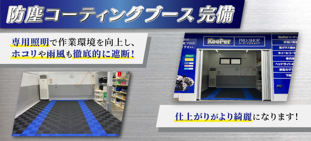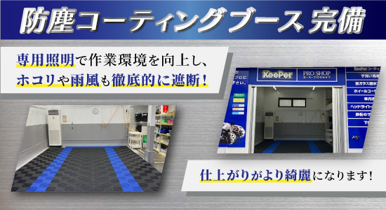 また、当店はキーパープロショップの中でも最新設備を完備しております!屋根付きのコーティング場も新設しましたので、天候に左右されずコーティングを施工することが可能です!